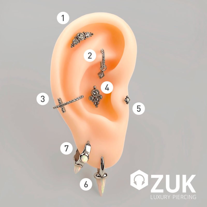 Te las explicamos una a una las perforaciones y joyas de la imagen de nuestra propuesta. Las puedes encontrar en nuestro estudio de Lleida y en nuestra tienda online zukluxurypiercing.com: