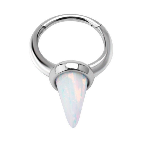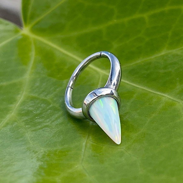 - Aro de acero quirúrgico grado 316L con un ópalo sintético de color blanco.