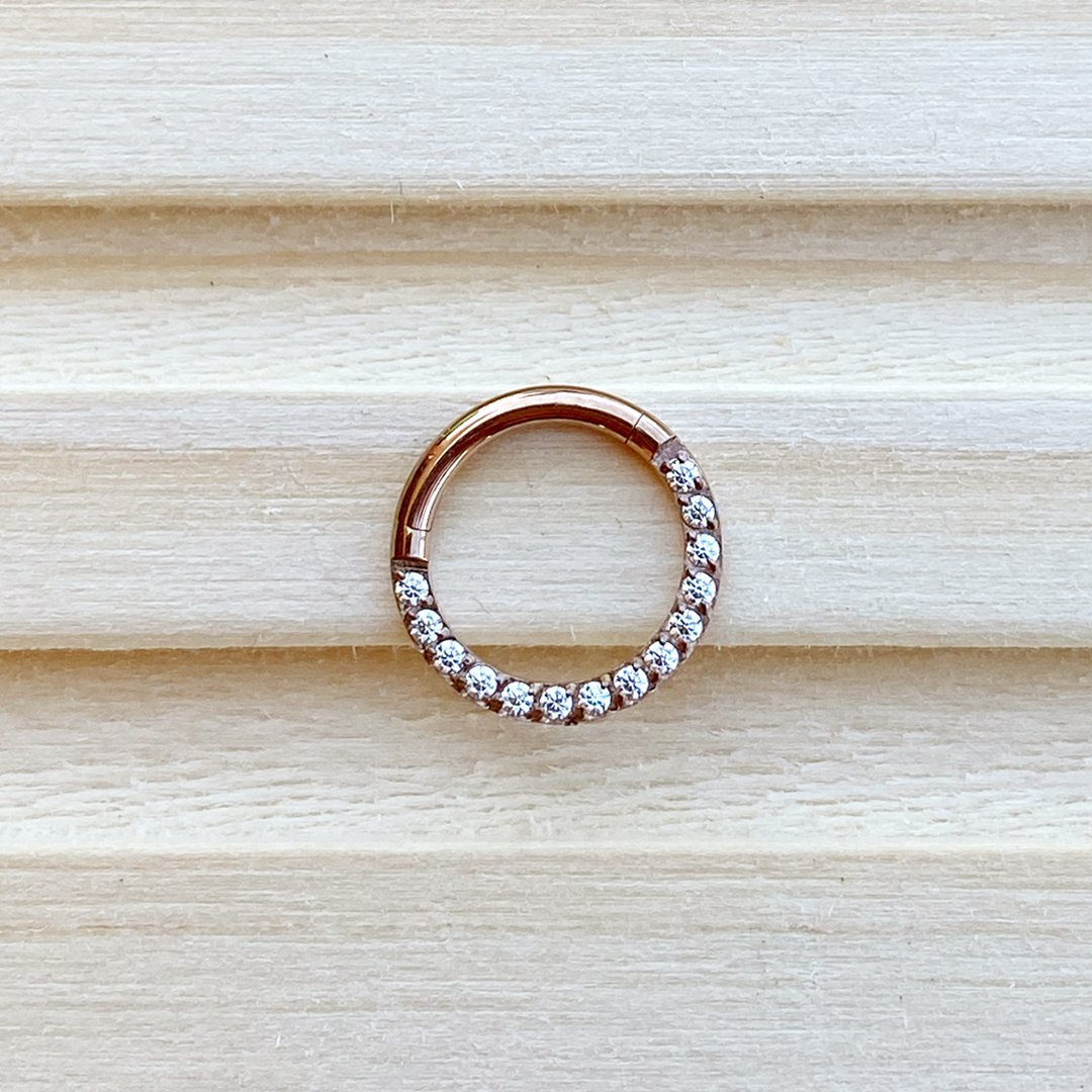 - Aro clicker de titanio grado implante ASTMF-136 con baño de oro amarillo rosa y zirconias frontales. De nuestra marca ZLP.