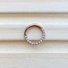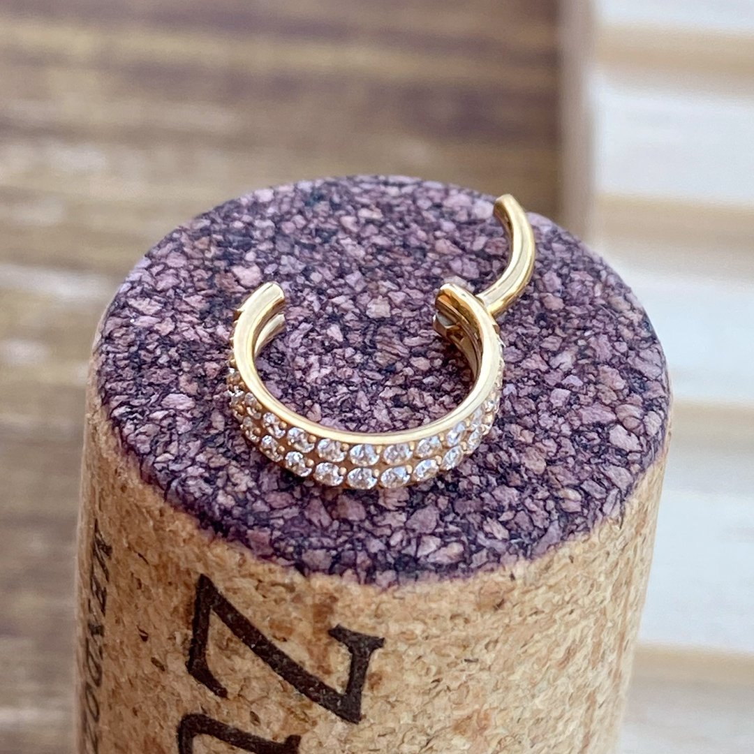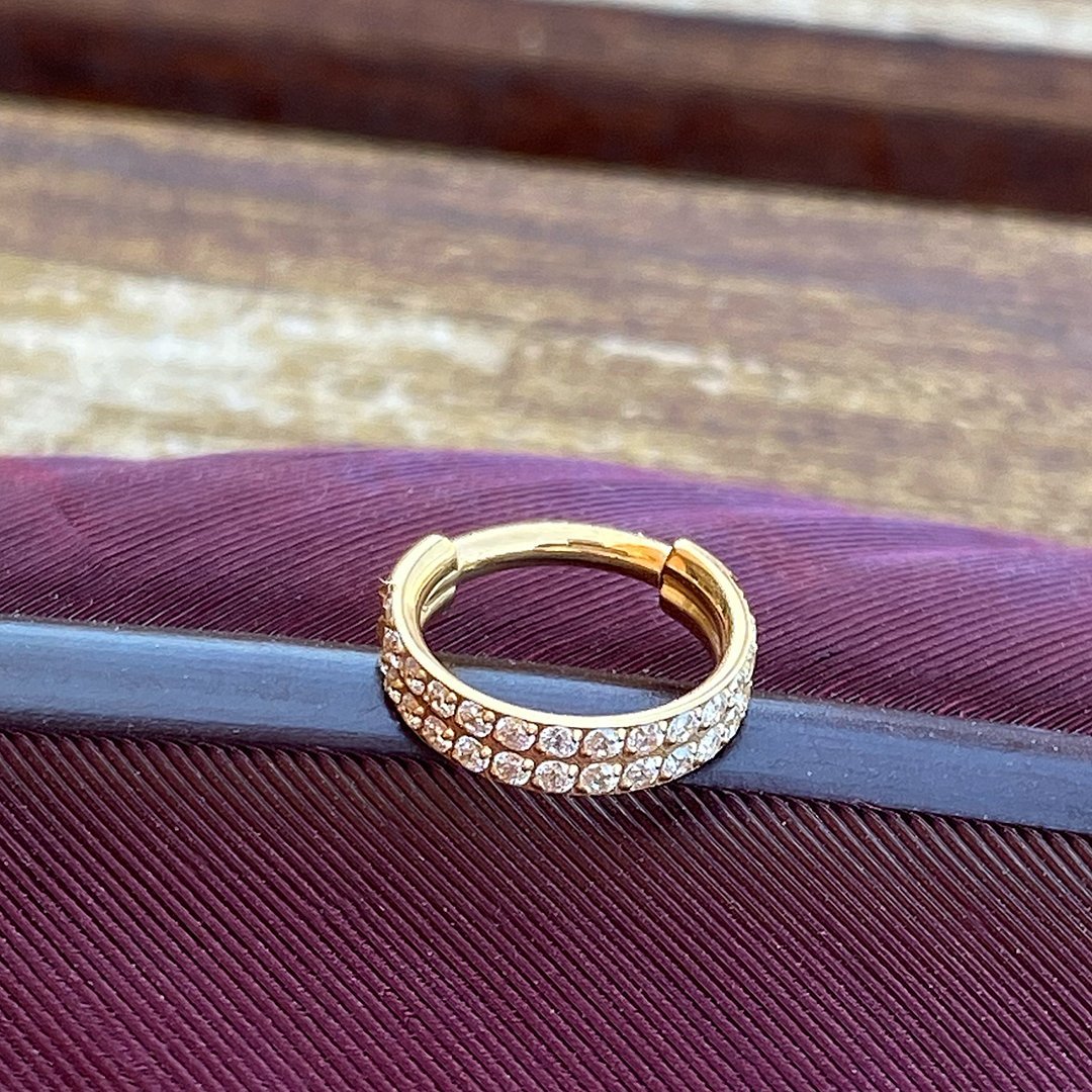- Aro clicker de titanio grado implante ASTMF-136 con baño de oro amarillo de 24 Kt. y dos hileras de zirconias corte diamante engarce pavé. De nuestra marca ZLP.