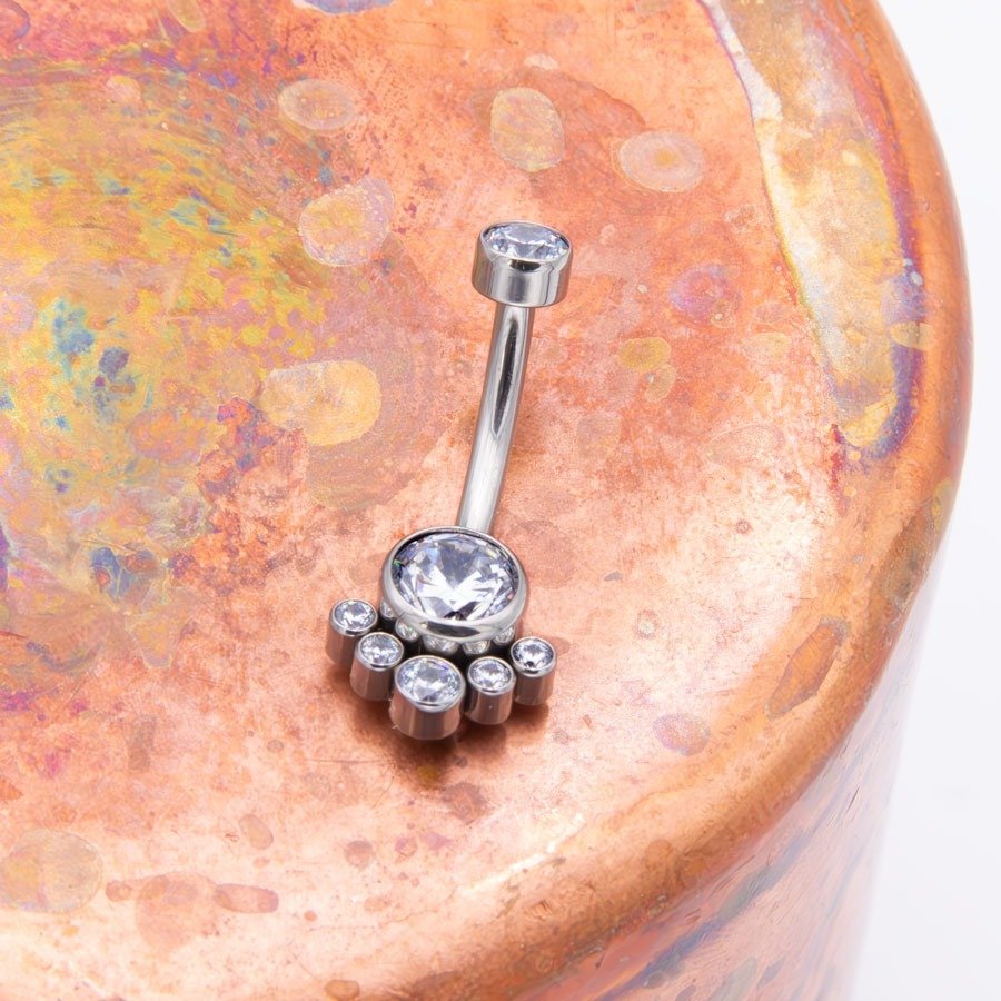 Piercing navel para ombligo. De titanio grado implante y con zirconias cúbicas de color blanco.