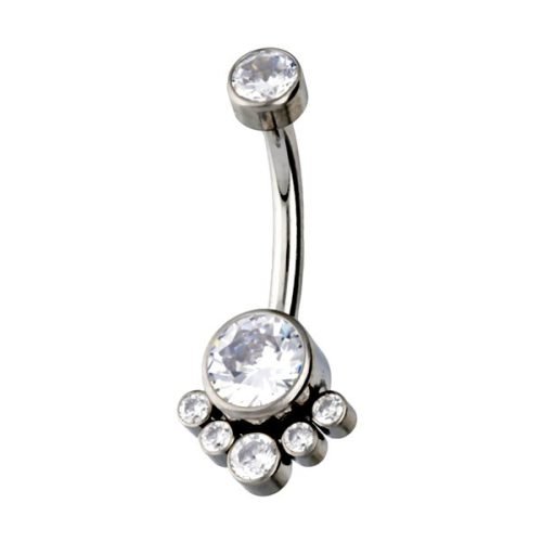 Piercing de ombligo, de titanio grado implante y con nueve zirconias cúbicas de color blanco.