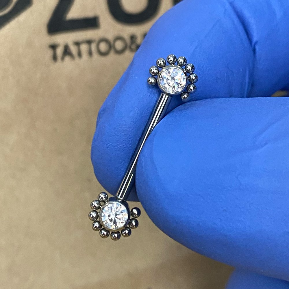 - Piercing de pezón de titanio ASTMF-136 pulido espejo con filigranas y con dos zirconias premium de color blanco.